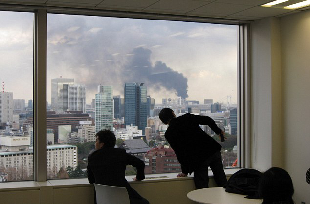 BELOW: A tiny fishing boat (centre of photo) is caught in a tsunami-induced whirlpool off the port of Oarai. Office workers in Tokyo watch an oil refinery fire caused by the quake in Chiba, north of the city.