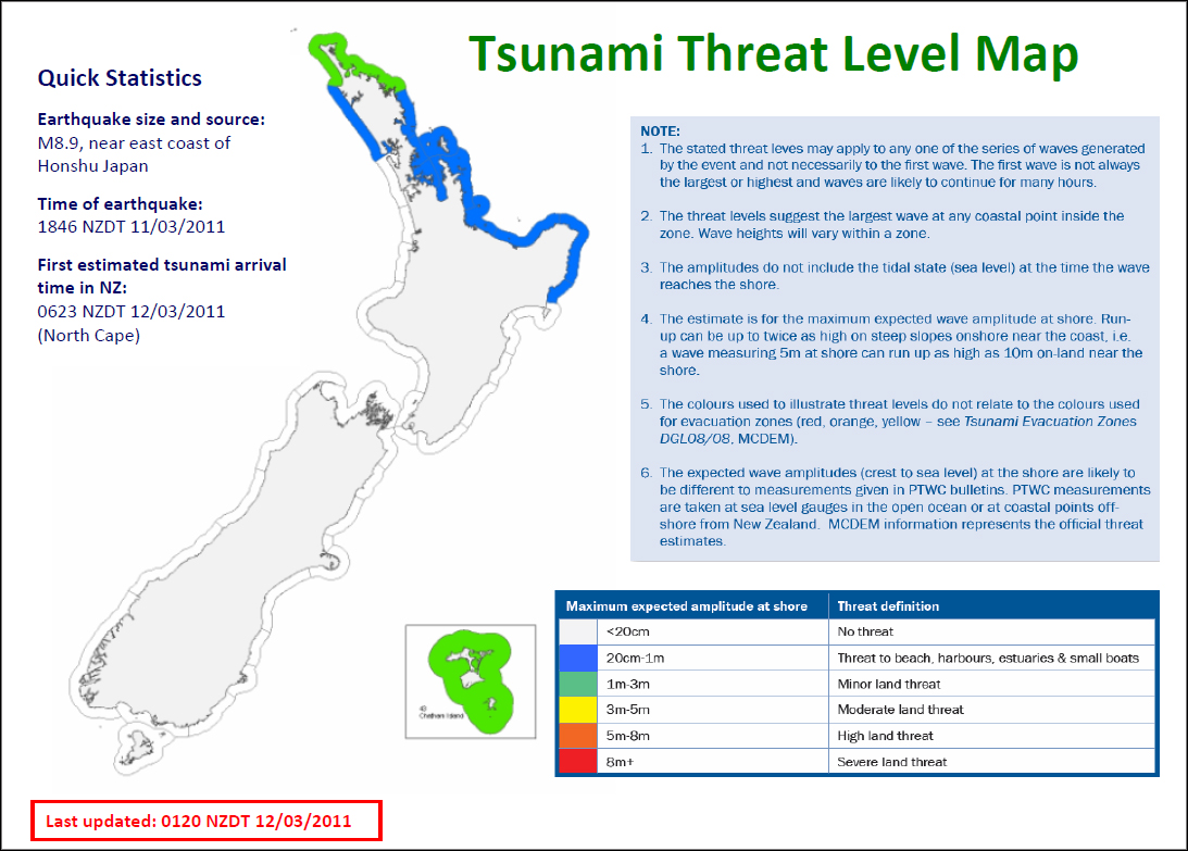 At this stage, NZ Civil Defence says there is no significant land threat, only a possible marine threat. People are warned to stay off beaches, and to bring boats into shore where possible.